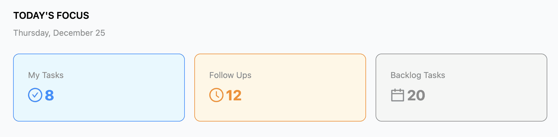 This hierarchy is supported by effective use of column width, card grouping, and typography weight, allowing users to quickly scan the screen. Clear labels such as “My Tasks,” “Follow Ups,” “Today,” and date indicators further reduce cognitive effort, as users don’t need to remember where information lives.