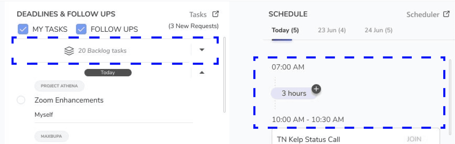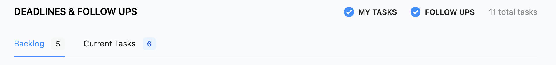 Deadlines & Tasks: Displaying backlog tasks alongside active tasks is helpful, as it provides visibility into upcoming work and helps users plan beyond just immediate deadlines.