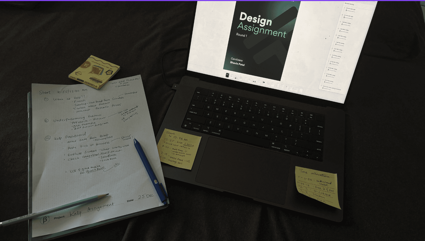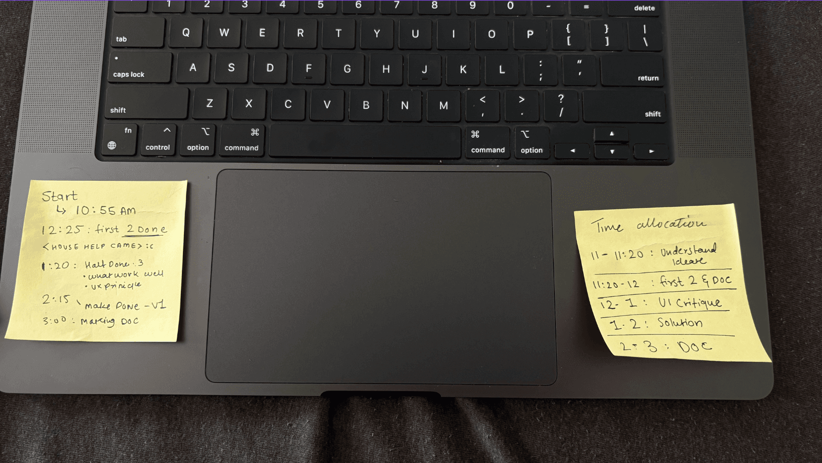 A sticky-note photo showing how I split and tracked my time across different parts of the assignment