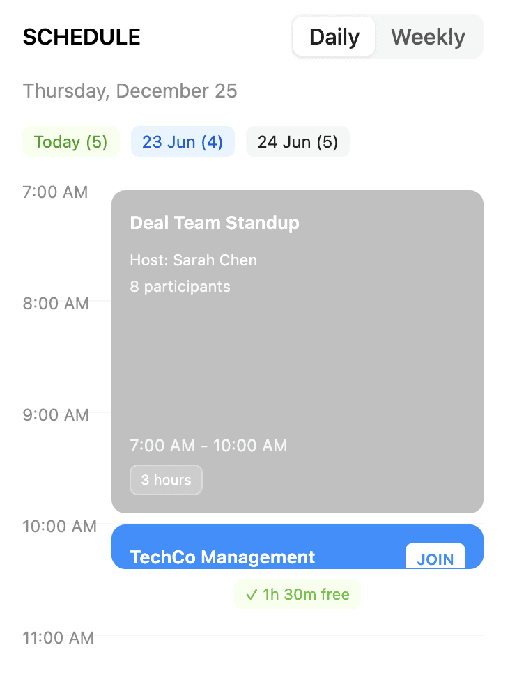 Schedule: Showing the available time between meetings is a thoughtful addition, as it helps users quickly understand their free slots and plan their work more effectively.