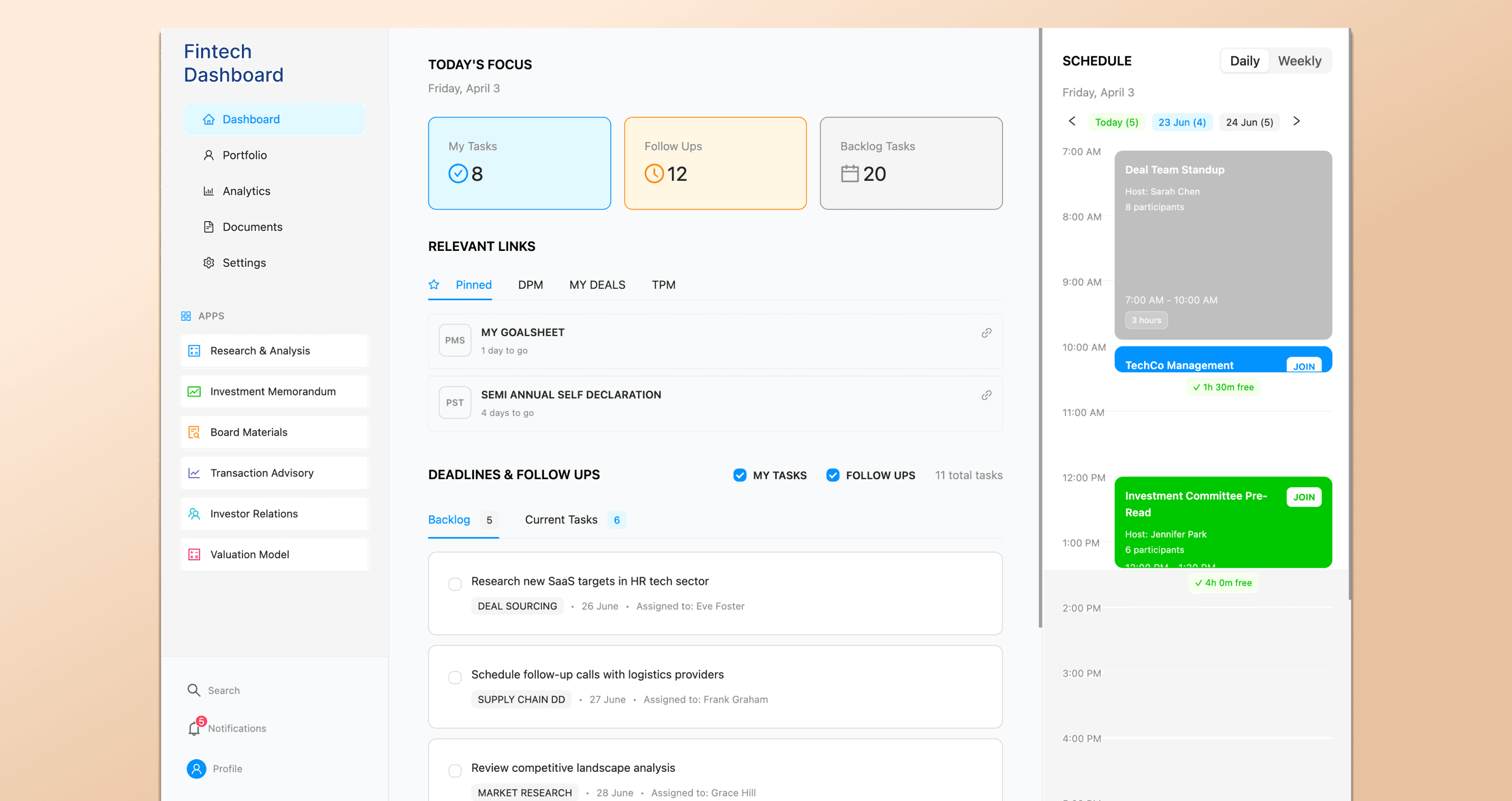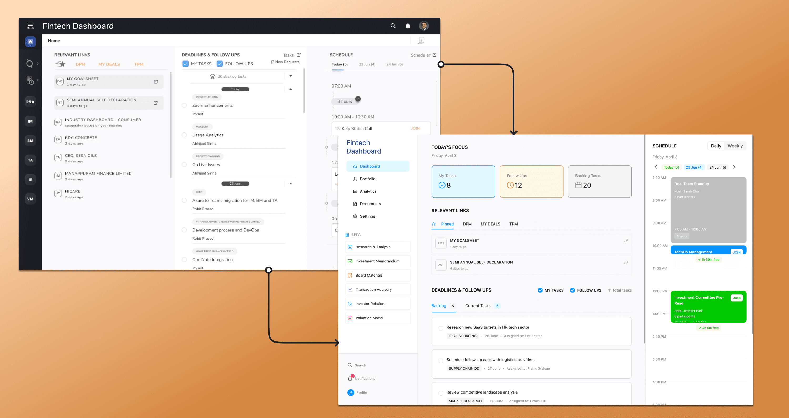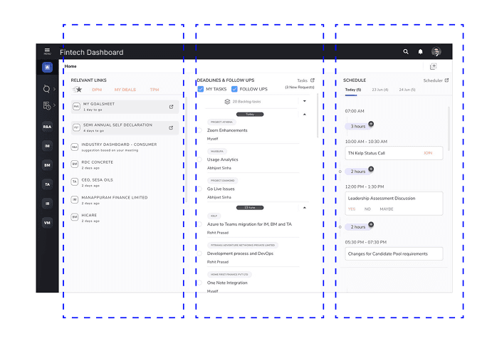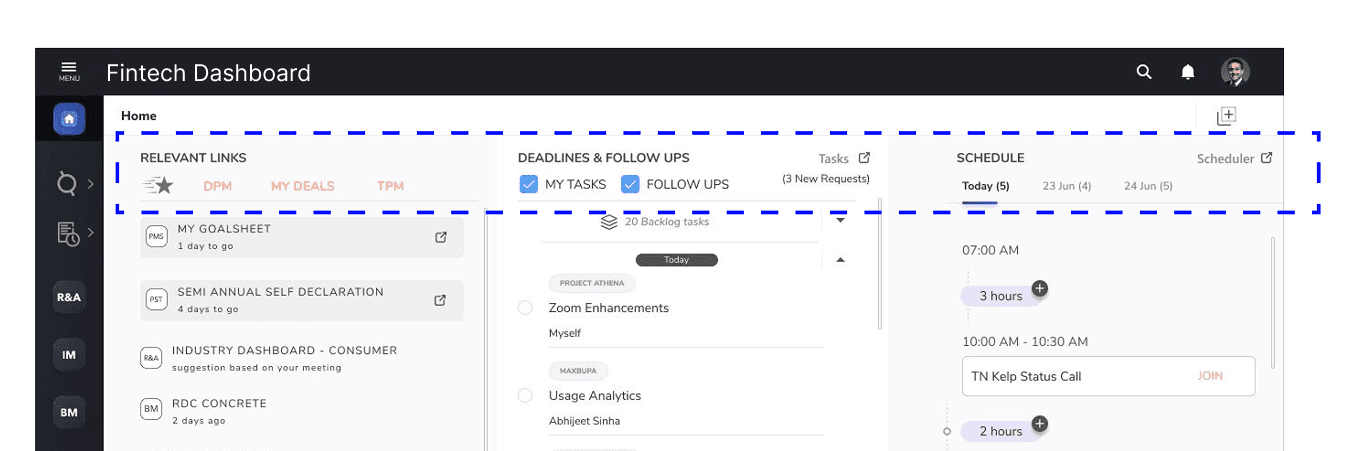 The visual hierarchy of the screen is mostly intuitive and helps guide user attention naturally. The center column (tasks and follow-ups) draws primary focus, followed by the schedule on the right, and then the relevant links on the left.