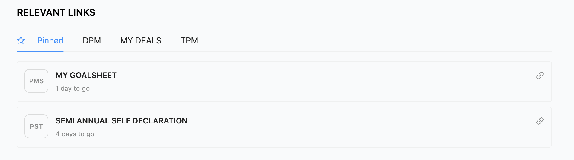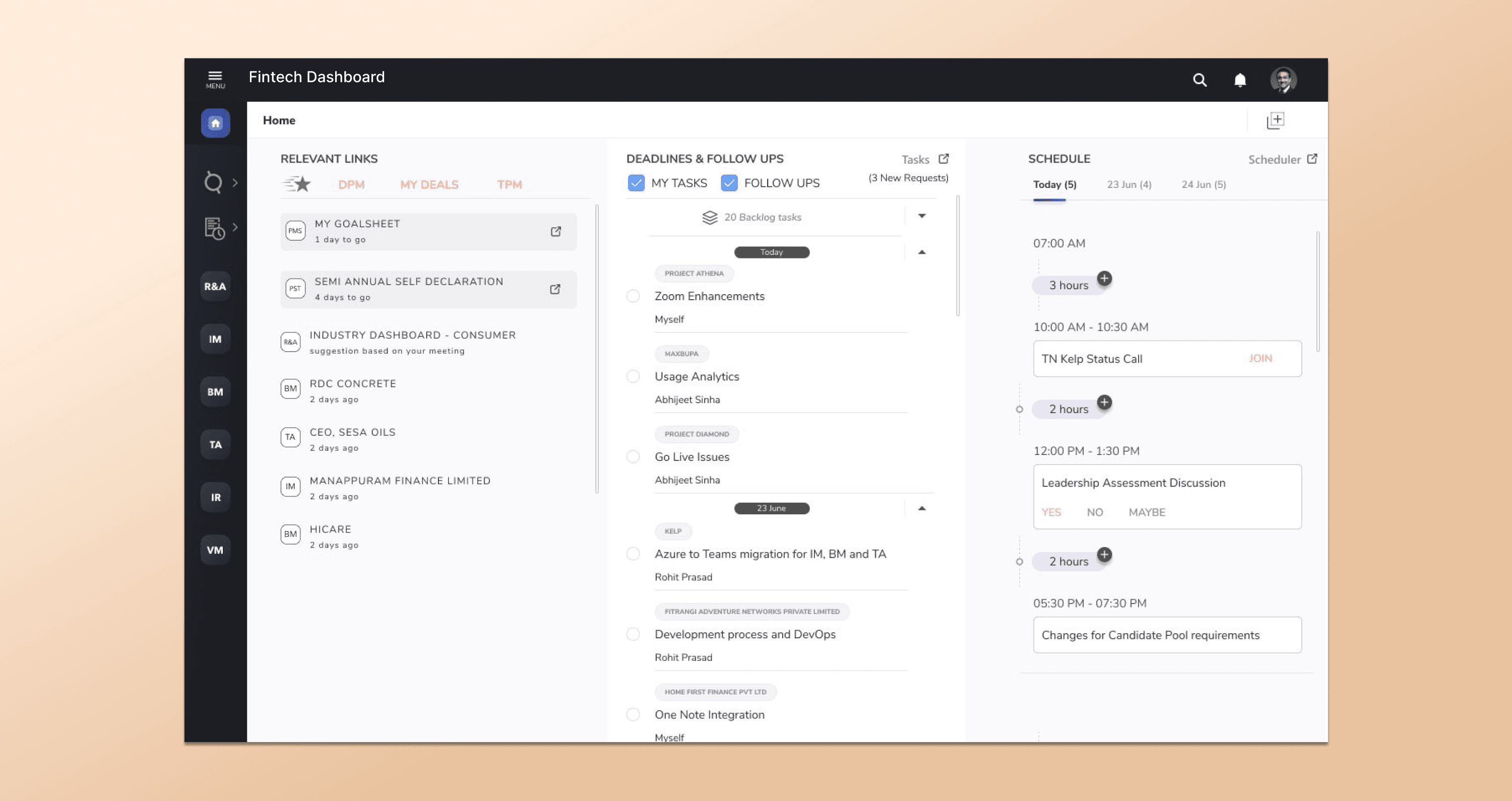 In the schedule, meeting cards don’t clearly show who the meeting is with, reducing context at a glance. In the Relevant Links section, suggested items look similar to regular links, and the top tabs use different components and colors, leading to visual inconsistency.